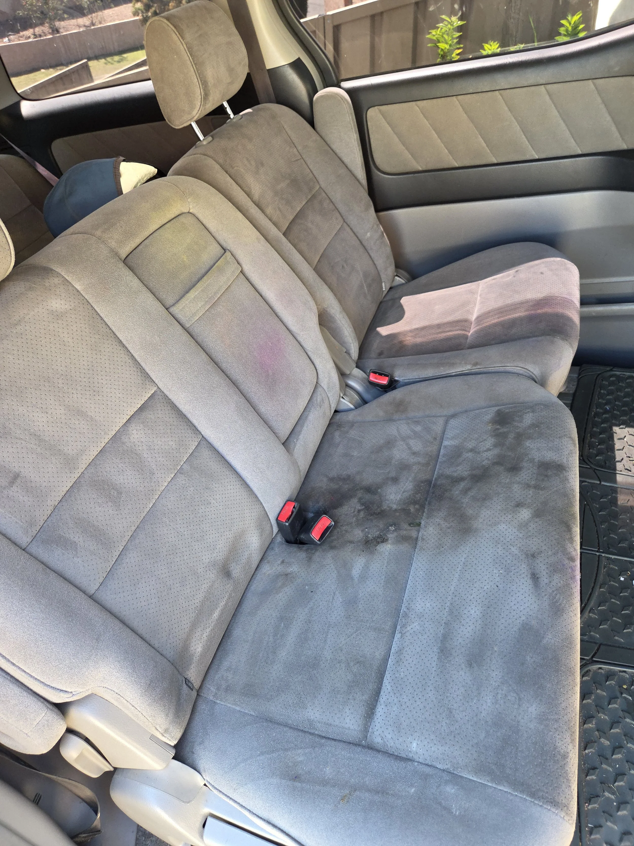The back seat of a vehicle with gray fabric upholstery that is stained and dirty.